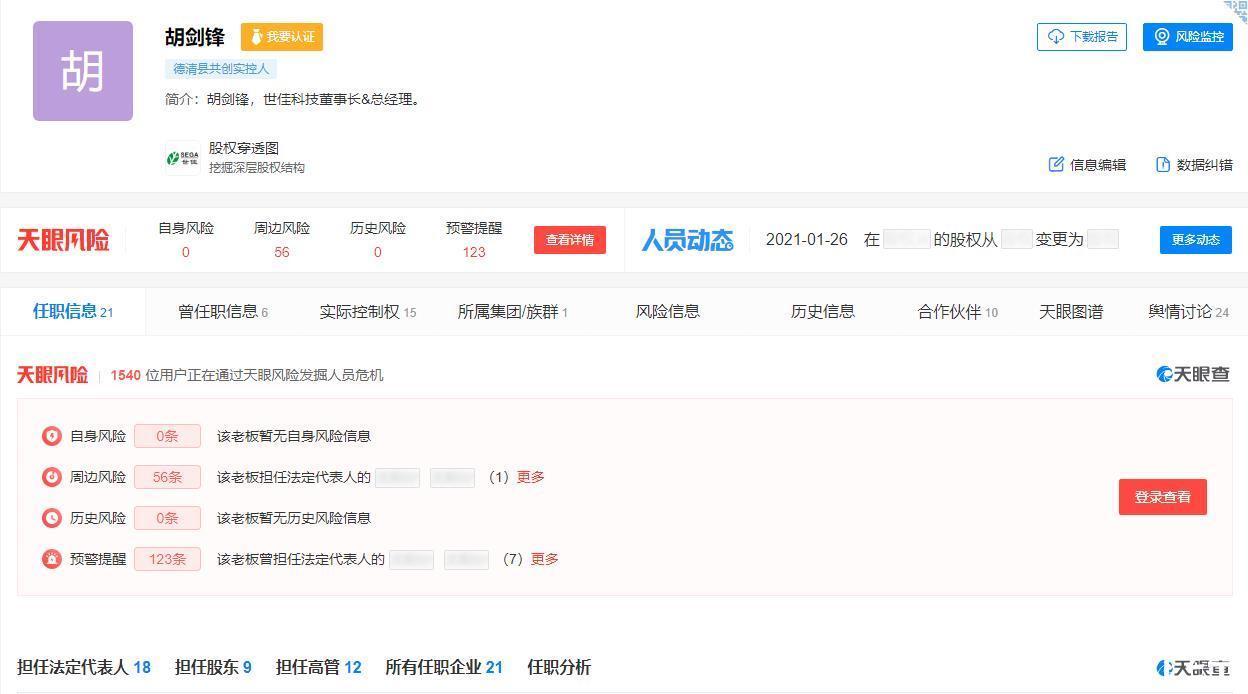 据天眼查数据显示,世佳科技董事长、总经理胡剑锋,目前有21条任职信息,担任股东9家企业,担任高管12家,且有实际控制权的企业15家。天眼风险显示,胡剑锋周边风险有56条,预警提醒达123条。